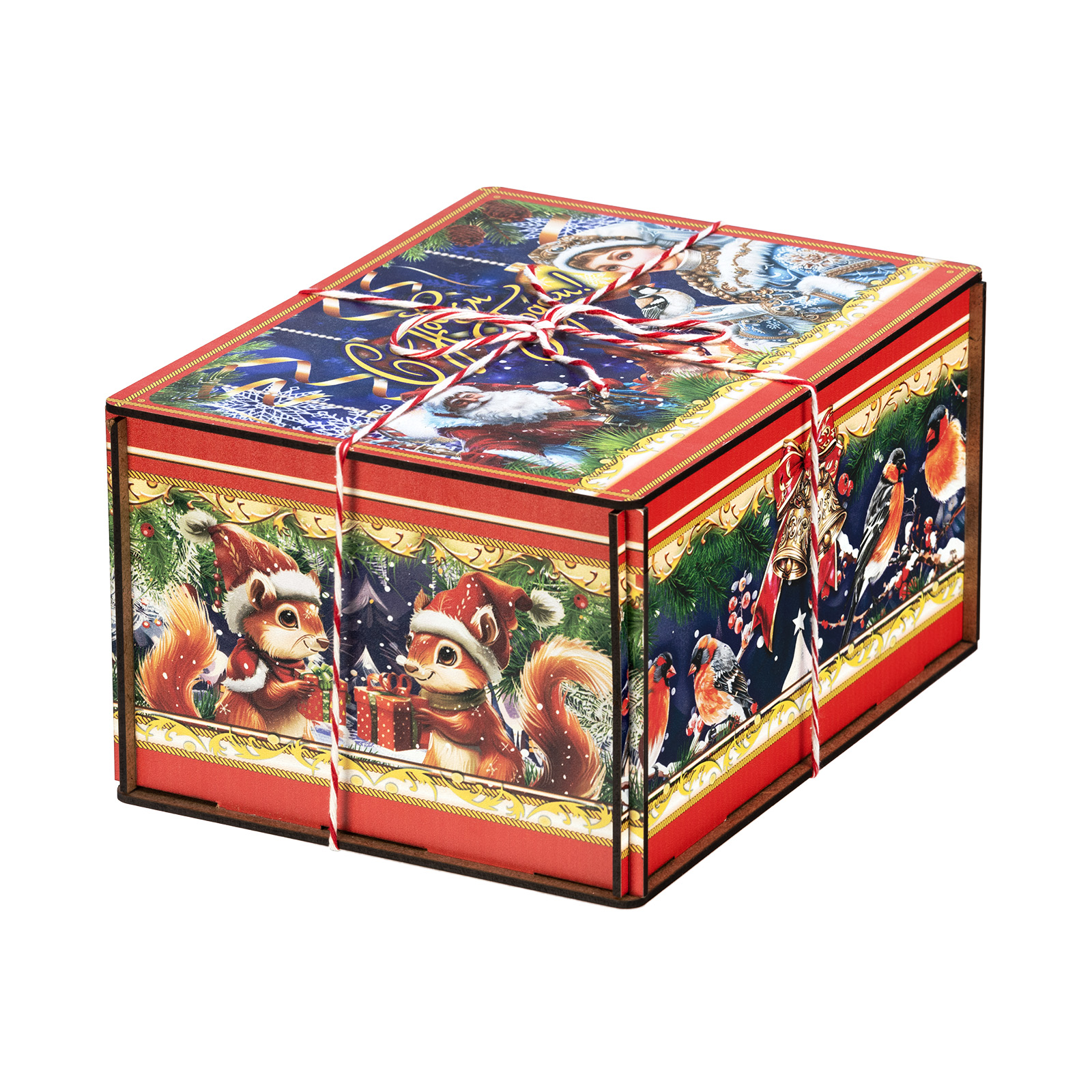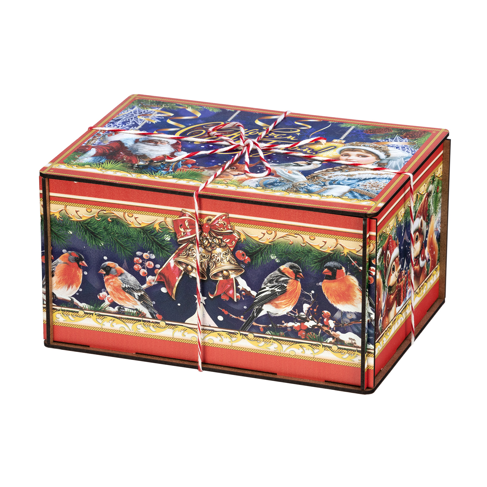 “Мелодия зимы” - это подарочный набор в деревянной упаковке, который прекрасно подойдет в качестве презента для подростка или взрослого. Это небольшой деревянный ящик, пестро украшенный со всех сторон разнообразными яркими иллюстрациями. На боковых гранях нарисованы лесные обитатели, а на крышке красуется изображение главных праздничных героев: Дедушка Мороз и Снегурочки. В состав подарка входит полтора килограмма кондитерских изделий на любой вкус, а также небольшой памятный сувенир в виде символа 2026 года - очаровательной лошадки. Благодаря такому подарку воспоминания о новогоднем торжестве останутся с вами на долгие месяцы.
