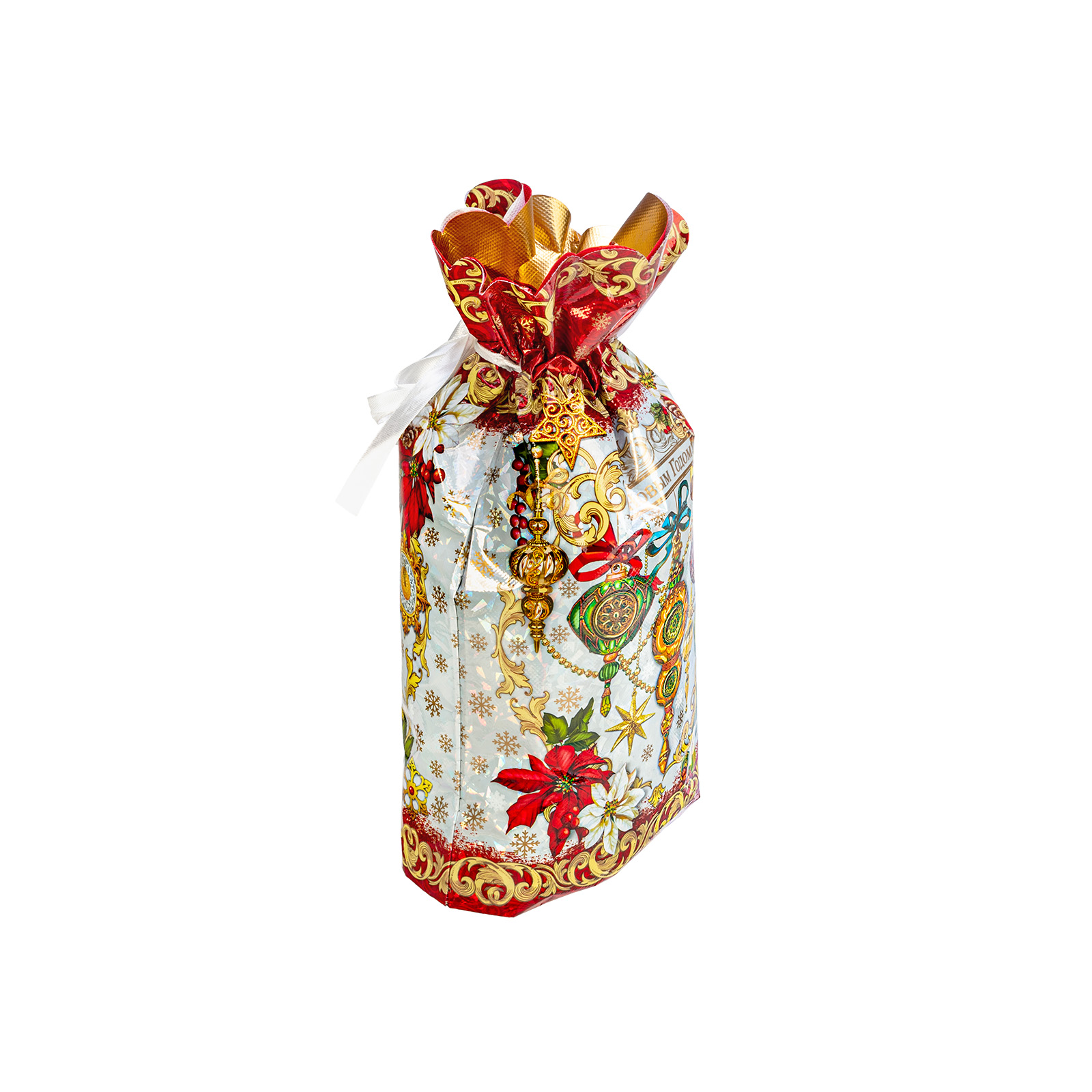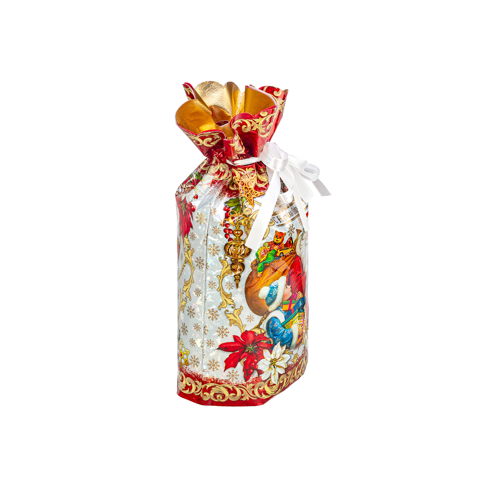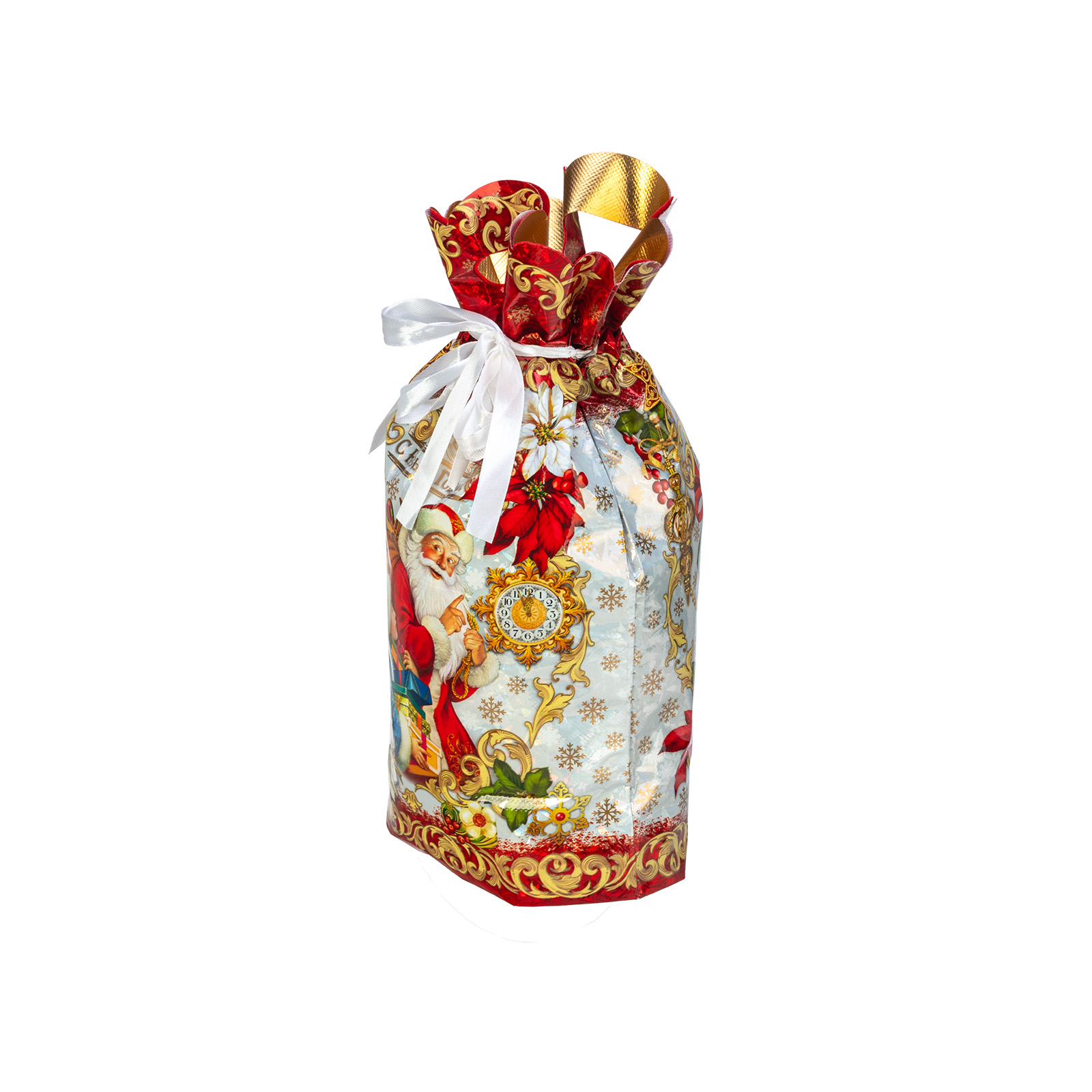 Интересный вариант новогоднего подарка – «Мешок Время чудес». Отлично подойдет на подарок в 2026 году с символом Лошадь. Внутри такого презента находится кондитерский набор весом 900 граммов.